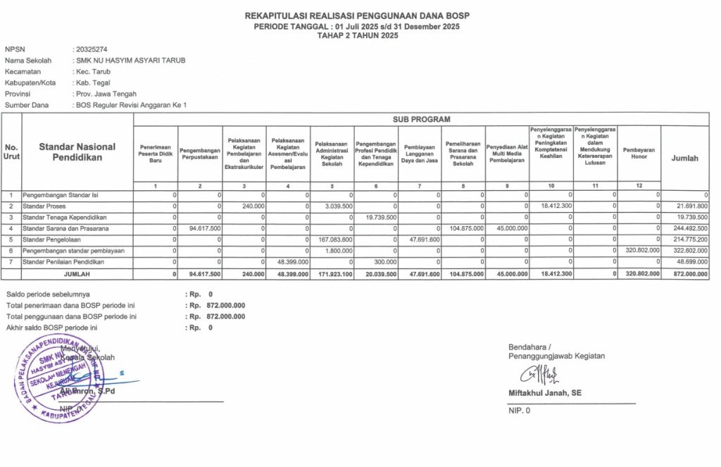 Dengan ini kami sampaikan bahwa realisasi penggunaan Dana Bantuan Operasional Satuan Pendidikan (BOSP) Tahun Anggaran 2025 di SMK NU Hasyim Asy’ari Tarub telah resmi diterbitkan dan tersedia untuk diketahui oleh seluruh warga sekolah serta masyarakat umum.
